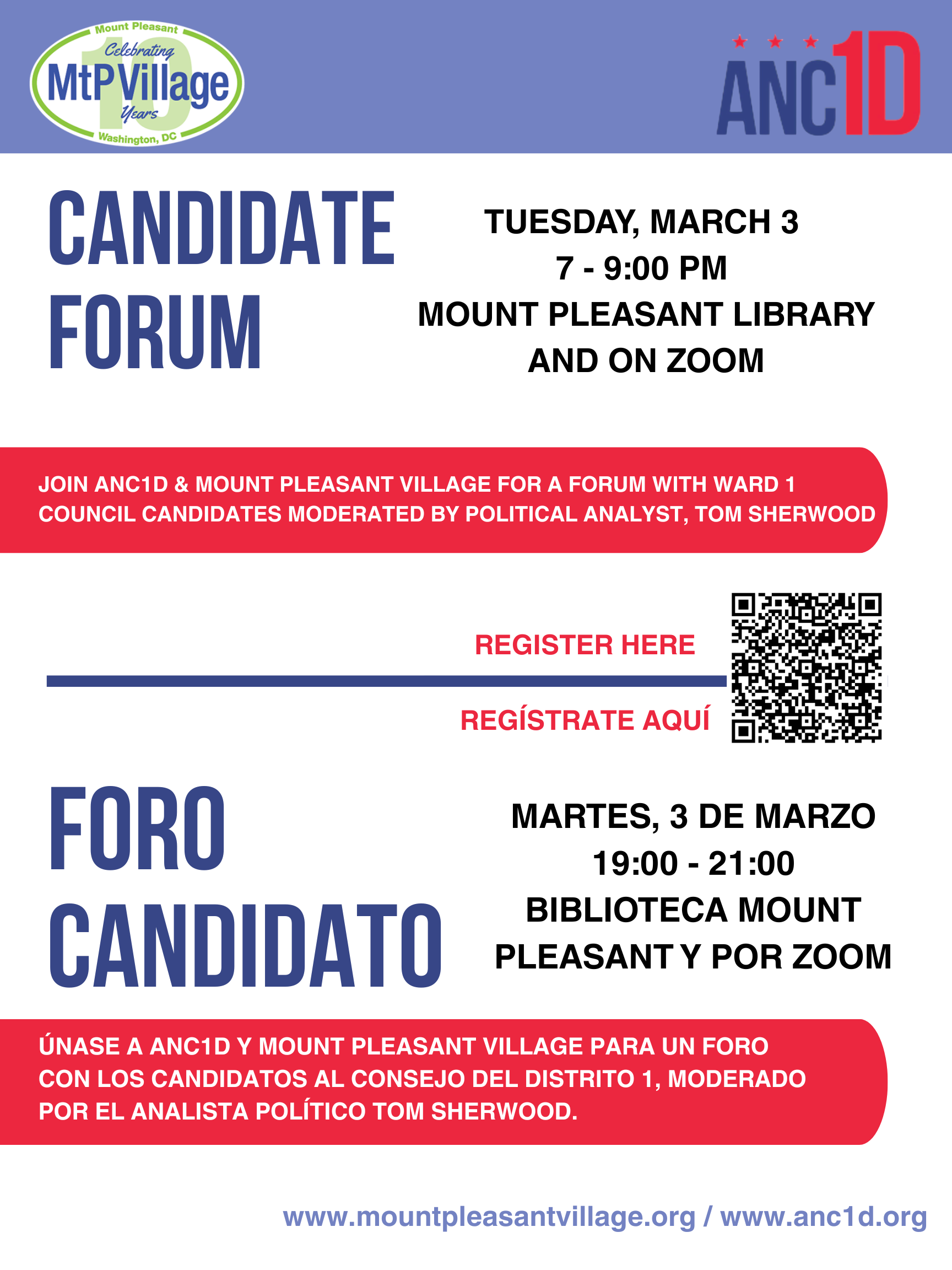 ANC1D and the Mount Pleasant Village have teamed up to bring your Ward 1 City Council Candidates to the Mount Pleasant Library! The candidate forum is on Tuesday, March 3 from 7-9:00 PM and will be moderated by local political analyst, Tom Sherwood. Attendees can join from the library in-person on via Zoom from home. Real time Spanish-language interpretation will be available on Zoom.